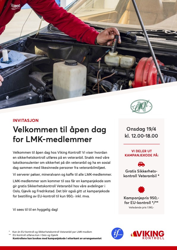Det serveres pølser, mineralvann og kaffe til alle LMK-medlemmene. LMK-medlemmer som stikker innom får en kampanje kode som gir gratis "Sikkerhetskontroll Veteranbil" hos vår avdelinger.