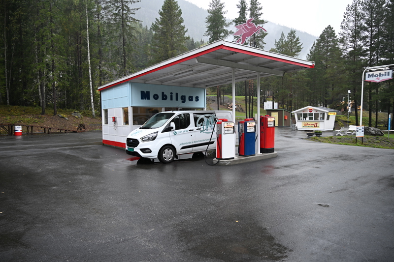 LMK Bilen ved drivstoffpumpene på Kjøretøyhistorisk museum, Lillehammer.
