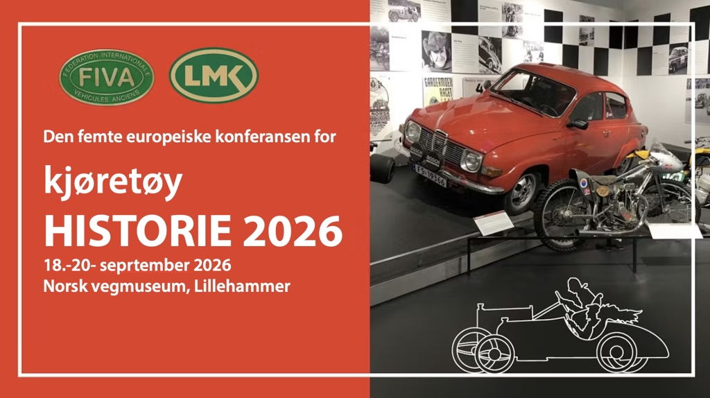 Kjøretøyhistorie 2026 Publisert av Lidvard Lundanes den 27.03.26. Kjøretøy historie 202618–20 September 2026 Norsk vegmuseum, Hunderfossen.Det inviteres til den 5. Pan-European Conference for Automotive History.Konferansen organiseres av FIVA i samarbeid med LMK, på Norsk vegmuseum, Hunderfossen.Påmelding til konferansen Klikk her for å gå til påmelding